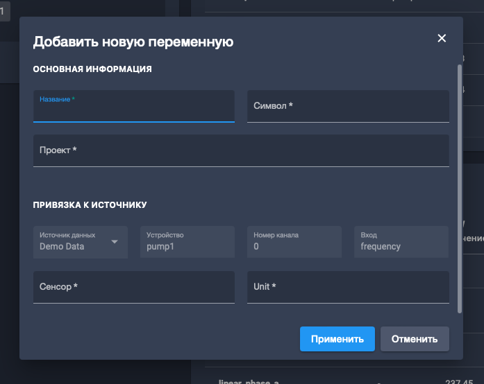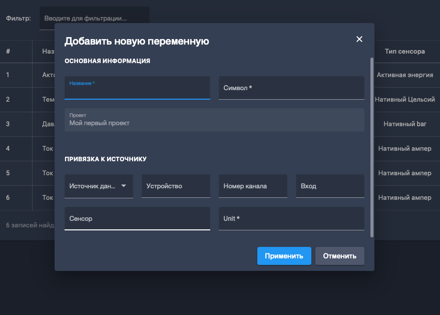 В разделе переменные глобального уровня (не уровень проекта) - мы можем наблюдать все переменные с привязкой к источникам данных, типом сенсора и проектам.